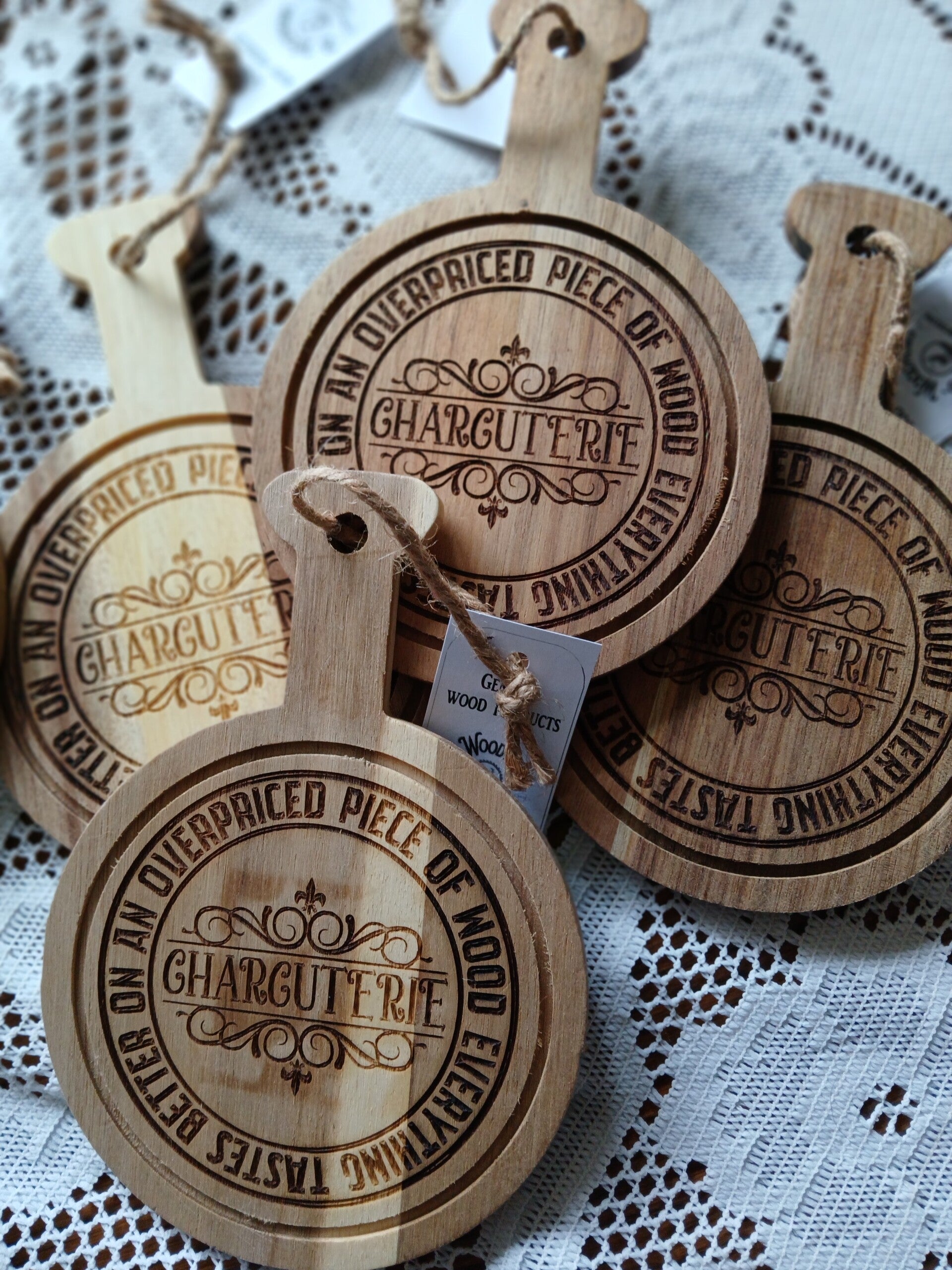 Elk plankje wordt met zorg vervaardigd uit acaciahout en afgewerkt met een mooi gegraveerd opschrift in een elegant lettertype. De natuurlijke houttekening geeft elk stuk een unieke uitstraling en zorgt voor een authentieke, gezellige look.